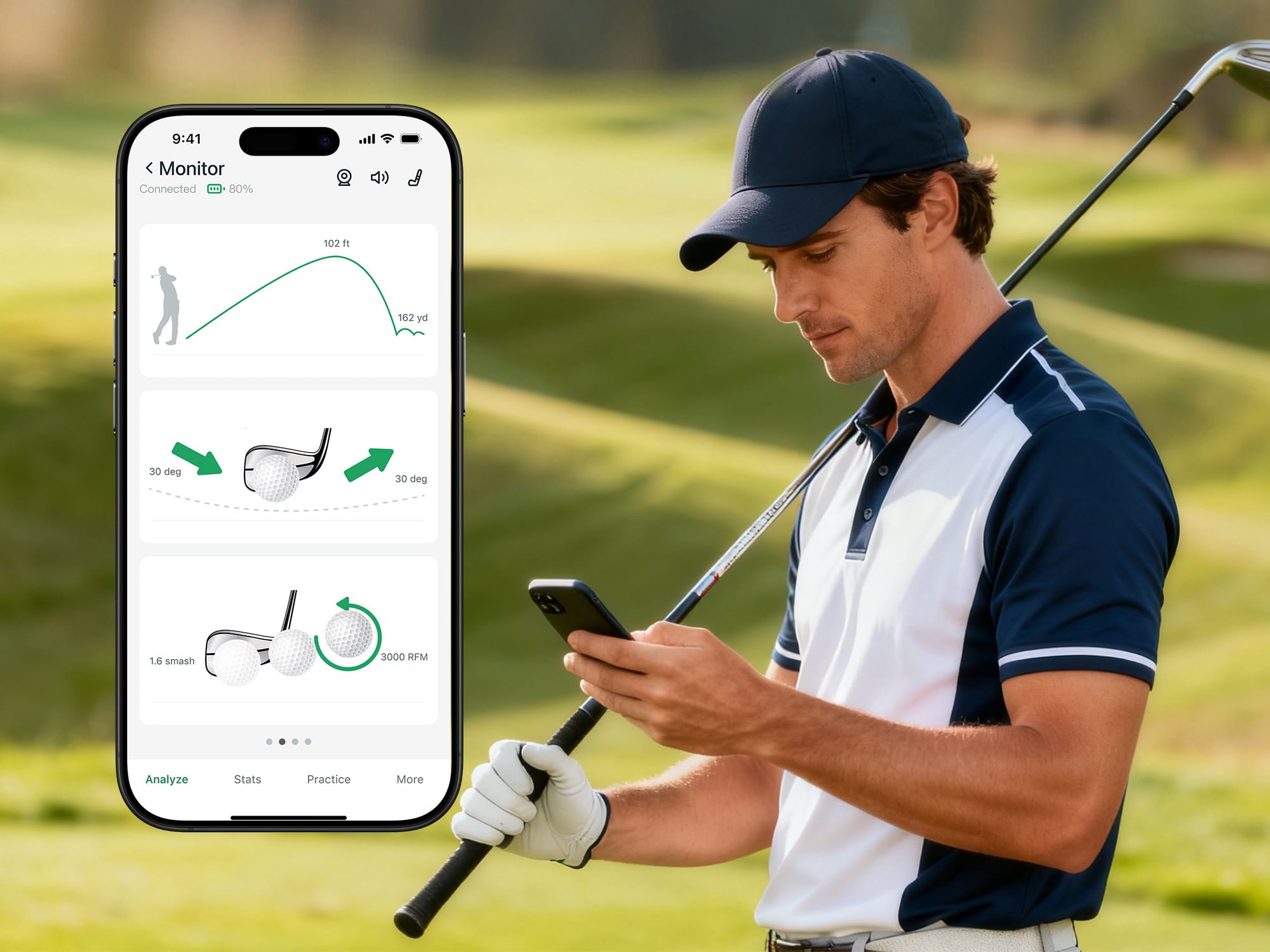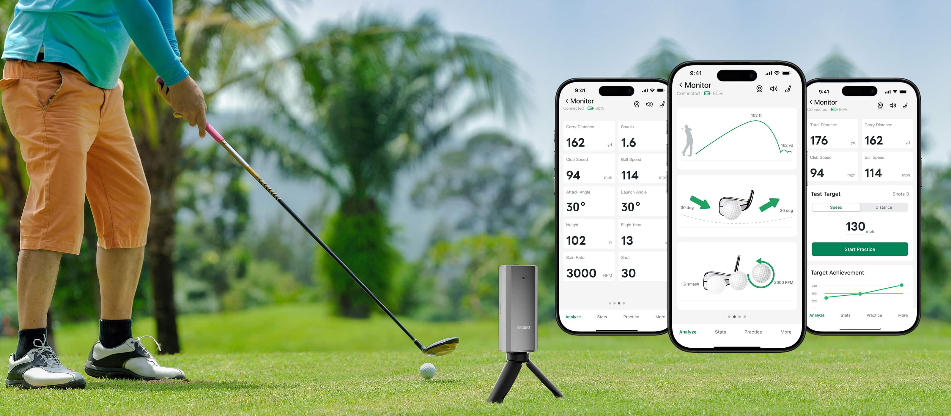 Pair the golf Monitors with birdilens app on your smartphone to unlock real-time insights into your game. Track over a dozen key swing metrics — including carry distance, ball speed, smash factor, spin rate, launch angle, and more.